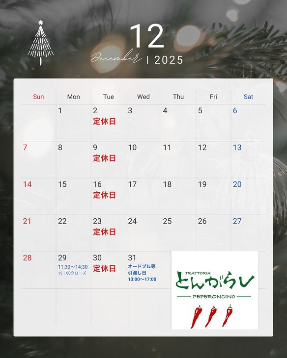 12月は毎週火曜日定休日です 年内は29日ランチまで 年末オードブルの受け取りは12/31の13:00〜17:00です