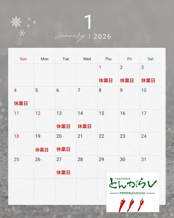 一月は5日より営業 13日14日 19日20日 28日休業日です