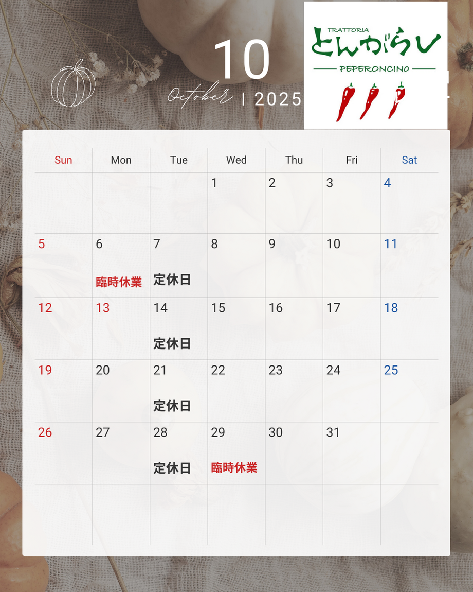10月は毎週火曜日と、6日(月)と29日(水)臨時休業いたします