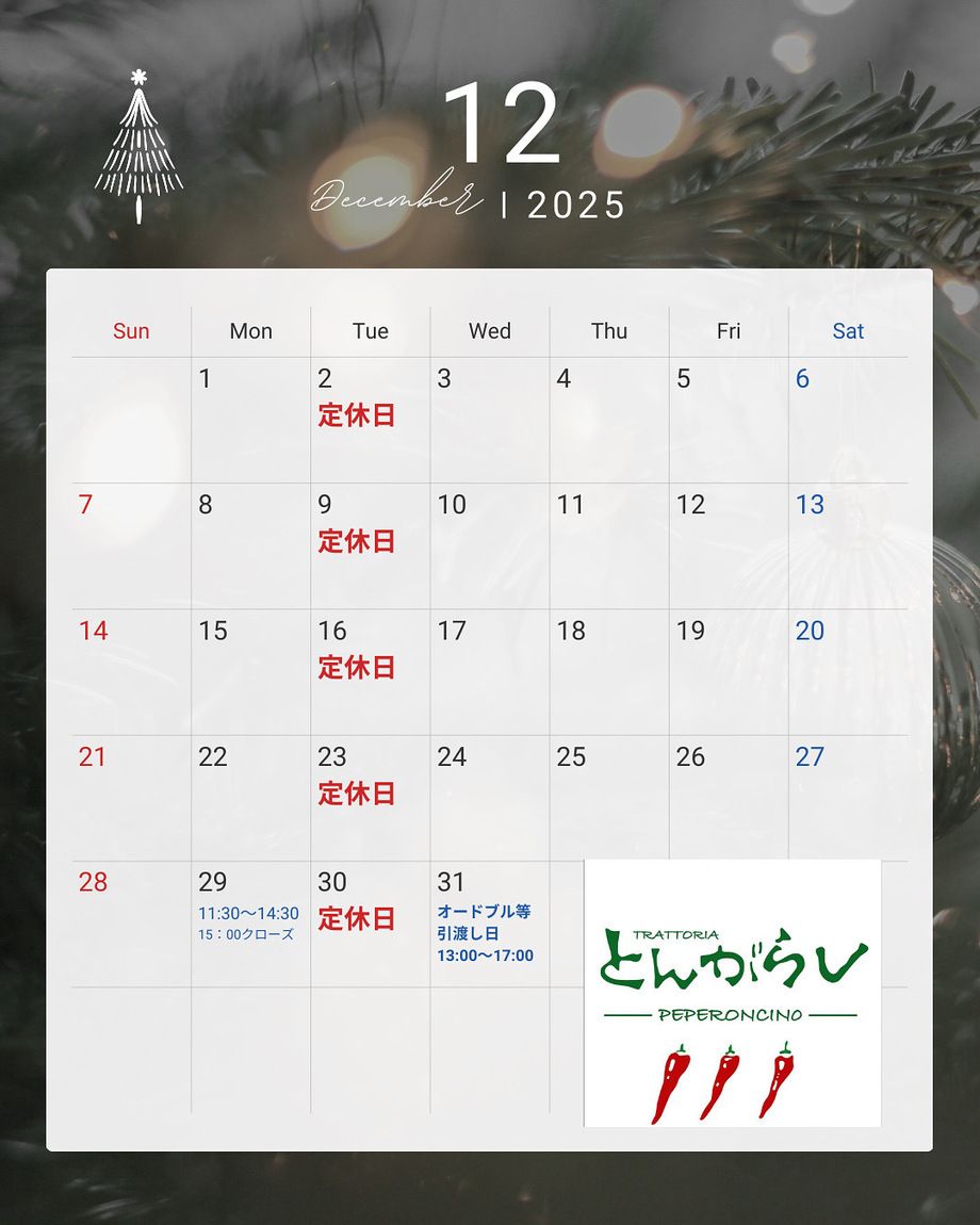 12月は毎週火曜日定休日です